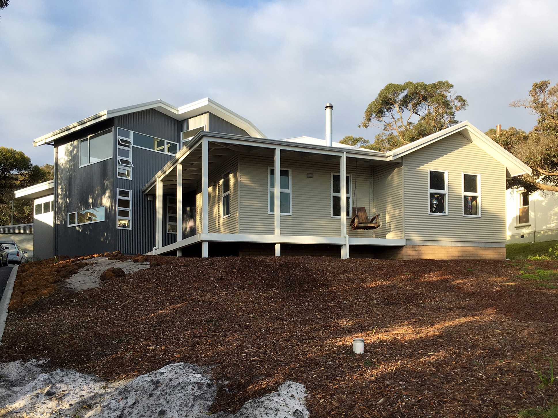 Brunswick Road is a residential project located in central Albany within the Albany Historic Town Design Policy Area. This project represents a juxtaposition between the historic town and the industrial port. The front part of the house is quite traditional in appearance and conforms with the Historic Town Policy, while the rear of the residence rotates to face north and appears to grow out of the front roof. The vertical windows of the rear addition reference the vertical windows on the grain towers often seen glowing green at night.